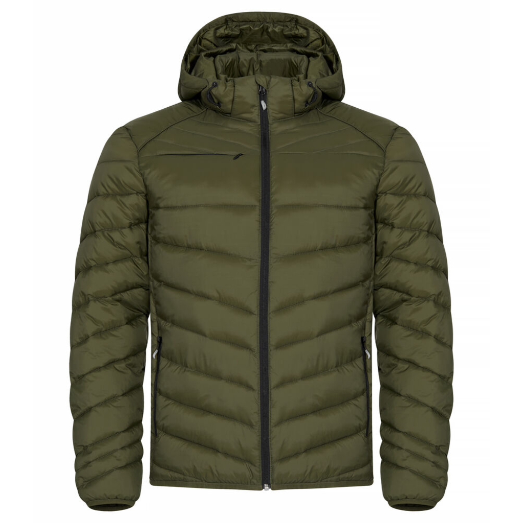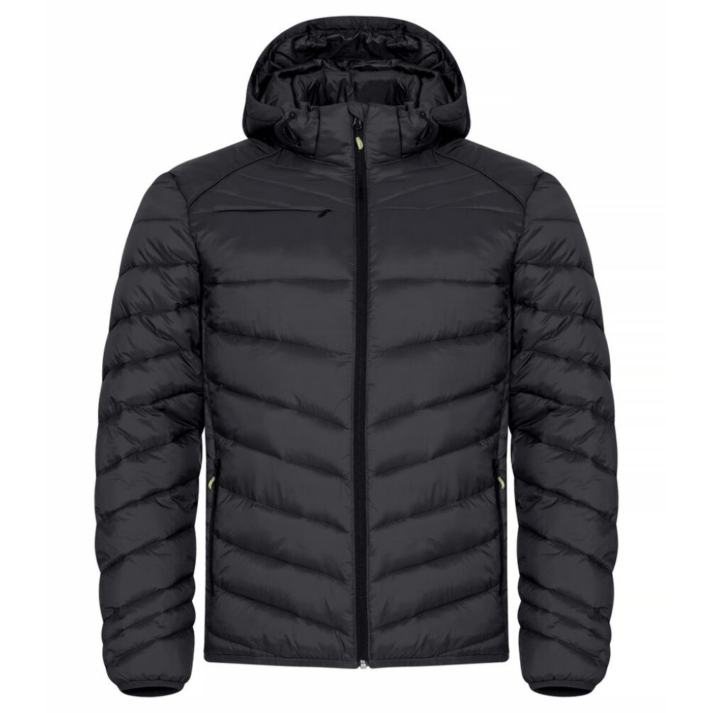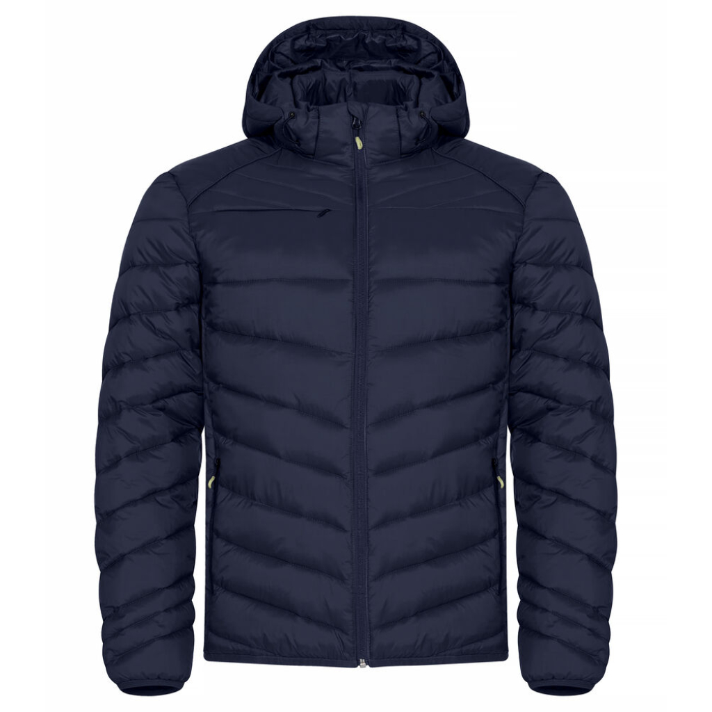 En varm og let jakke med dunlignende polstring. Fremstillet af 100% recycled polyamid. 3 udvendige lommer med lynlås og 2 inderlommer. Elastisk tape på krop og arme. Dame model er med aftagelig hætte. Kommer med farvet strop, høretelefonløsning og lynlås skyder.